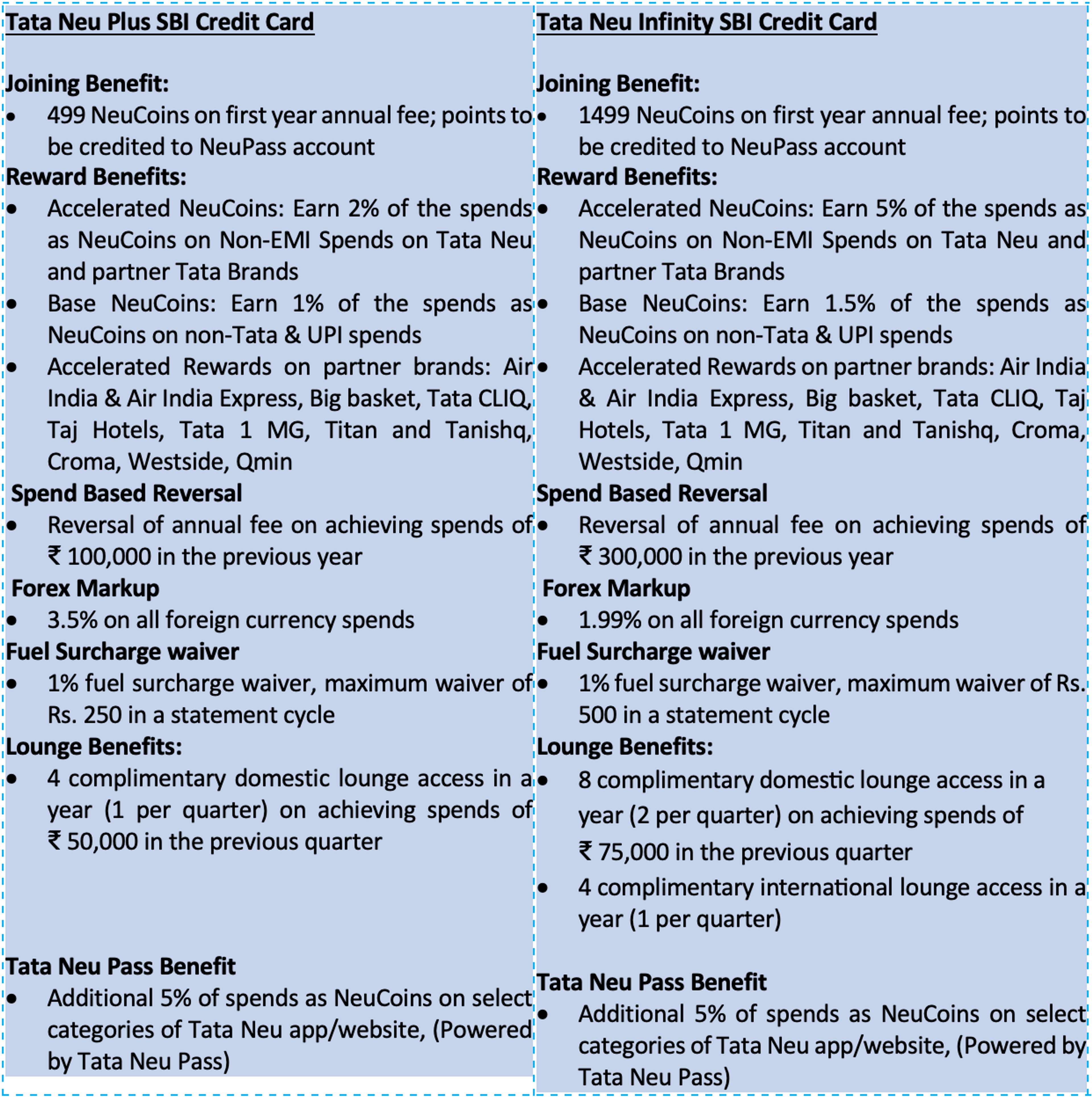 The joining and annual renewal fee of Tata Neu Infinity SBI Card is ₹1,499 plus applicable taxes and that of Tata Neu Plus SBI Card is ₹499 plus applicable taxes. Both variants of the contactless card are available on RuPay as well as Visa payment platforms.