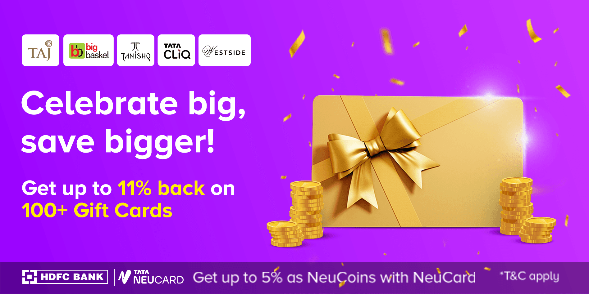 Tata Neu customers can earn NeuCoins and get exciting discounts and incentives offered by the individual gift card brands. In addition, Tata Neu HDFC Bank Credit Card holders will earn an extra 5% NeuCoins on all gift card purchases, bringing the total benefits up to 15% NeuCoins. All rewards earned in NeuCoins can be redeemed across the Tata Neu ecosystem.